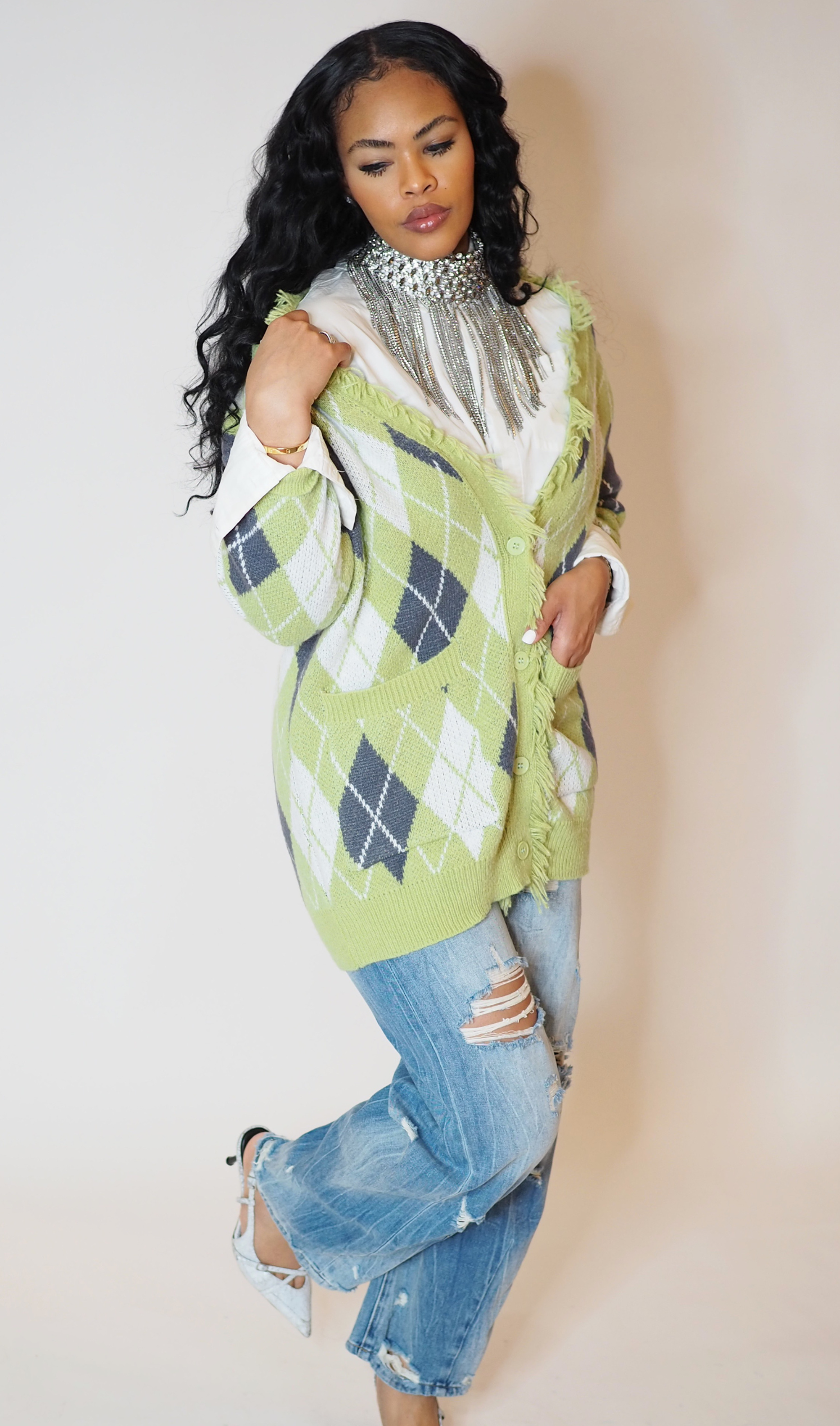 A COZY STATEMENT LAYER WITH A CLASSIC ARGYLE PATTERN AND RELAXED OVERSIZED FIT. DESIGNED WITH FRONT BUTTONS AND PATCH POCKETS, THIS CARDIGAN ADDS AN EFFORTLESS TOUCH OF TEXTURE AND COLOR TO EVERYDAY LOOKS. PERFECT FOR LAYERING AND TRANSITIONING INTO SPRING.