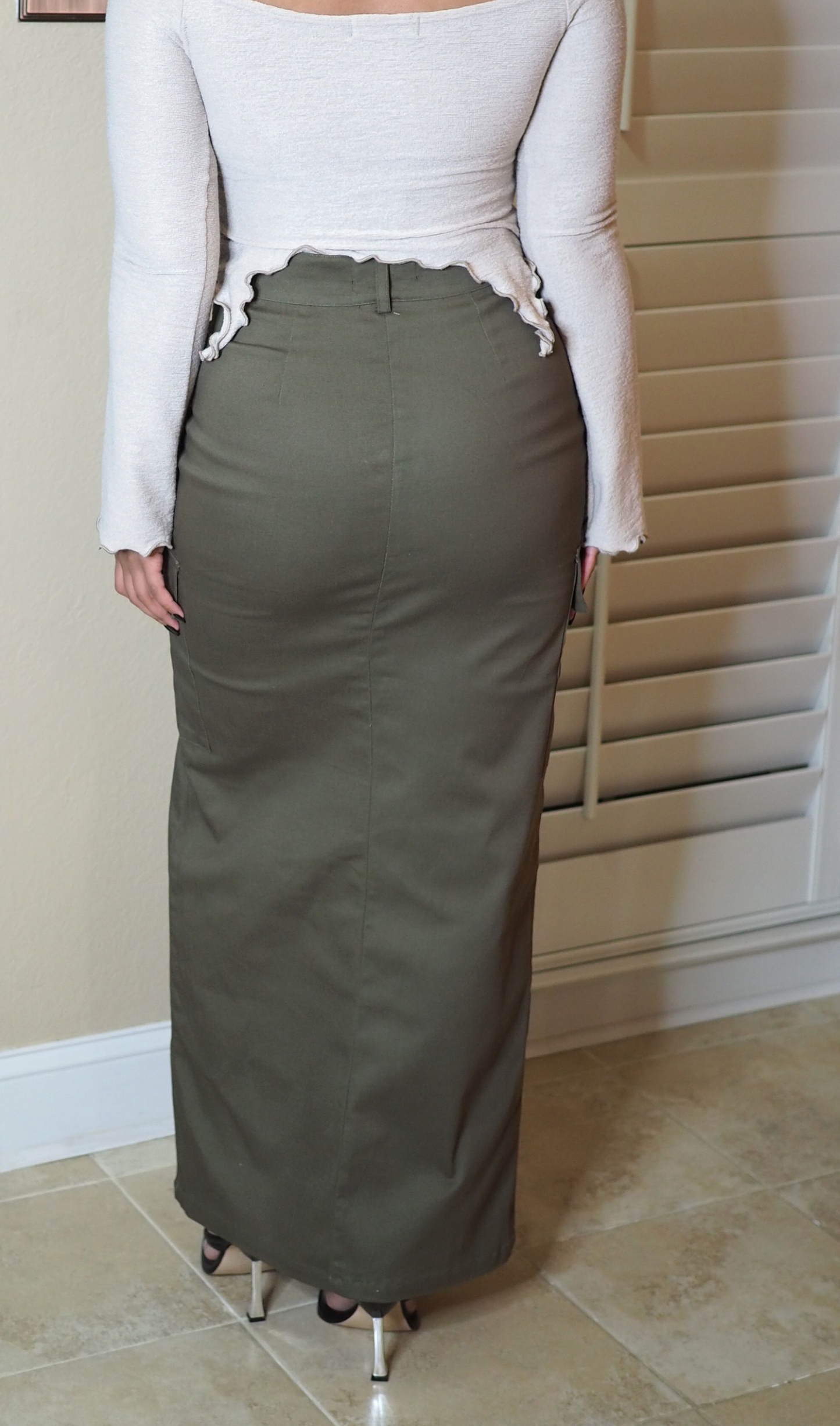 MAXI CARGO SKIRT THAT FEATURES A FRONT SPLIT AND SIDE POCKETS IN THE COLOR OLIVE. THE SKIRT DOES HAVE STRETCH!