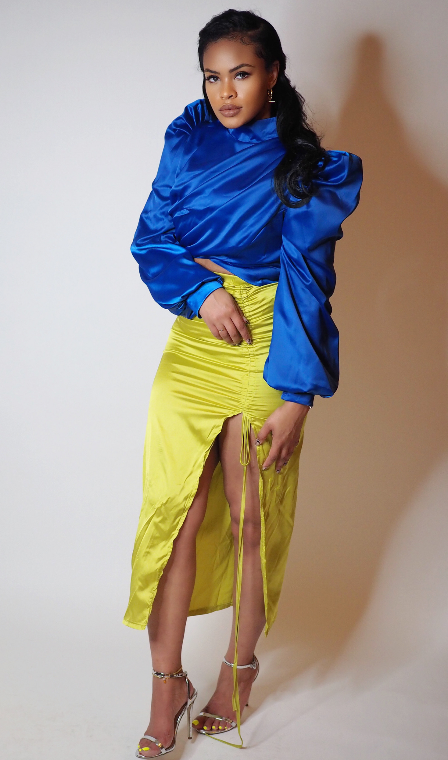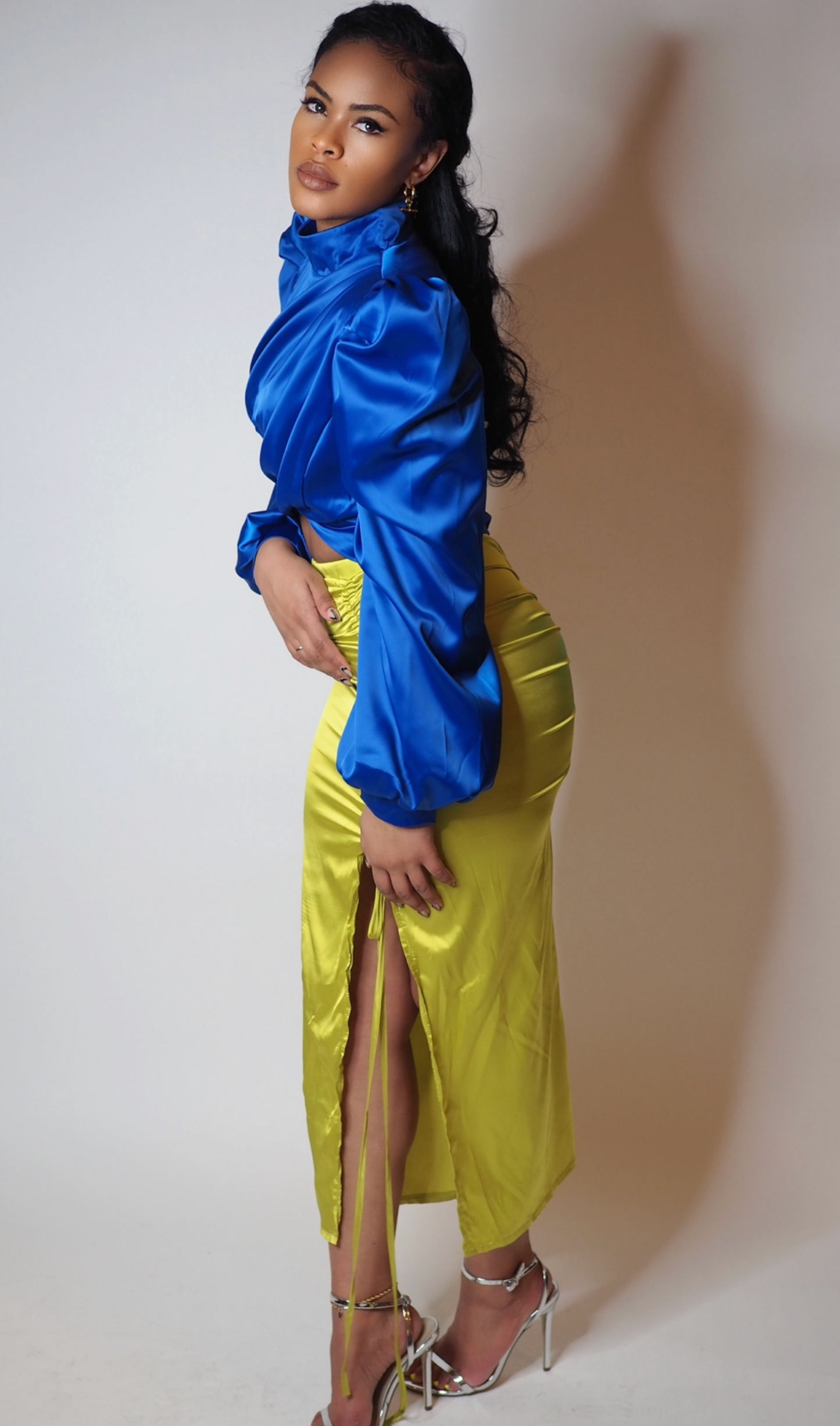 RUFFLED PUFF SLEEVE CROP BLOUSE WITH HEM FRONT DETAIL IN THE COLOR ROYAL BLUE. BACK ZIPPER CLOSURE AND MOCK NECK DETAIL.