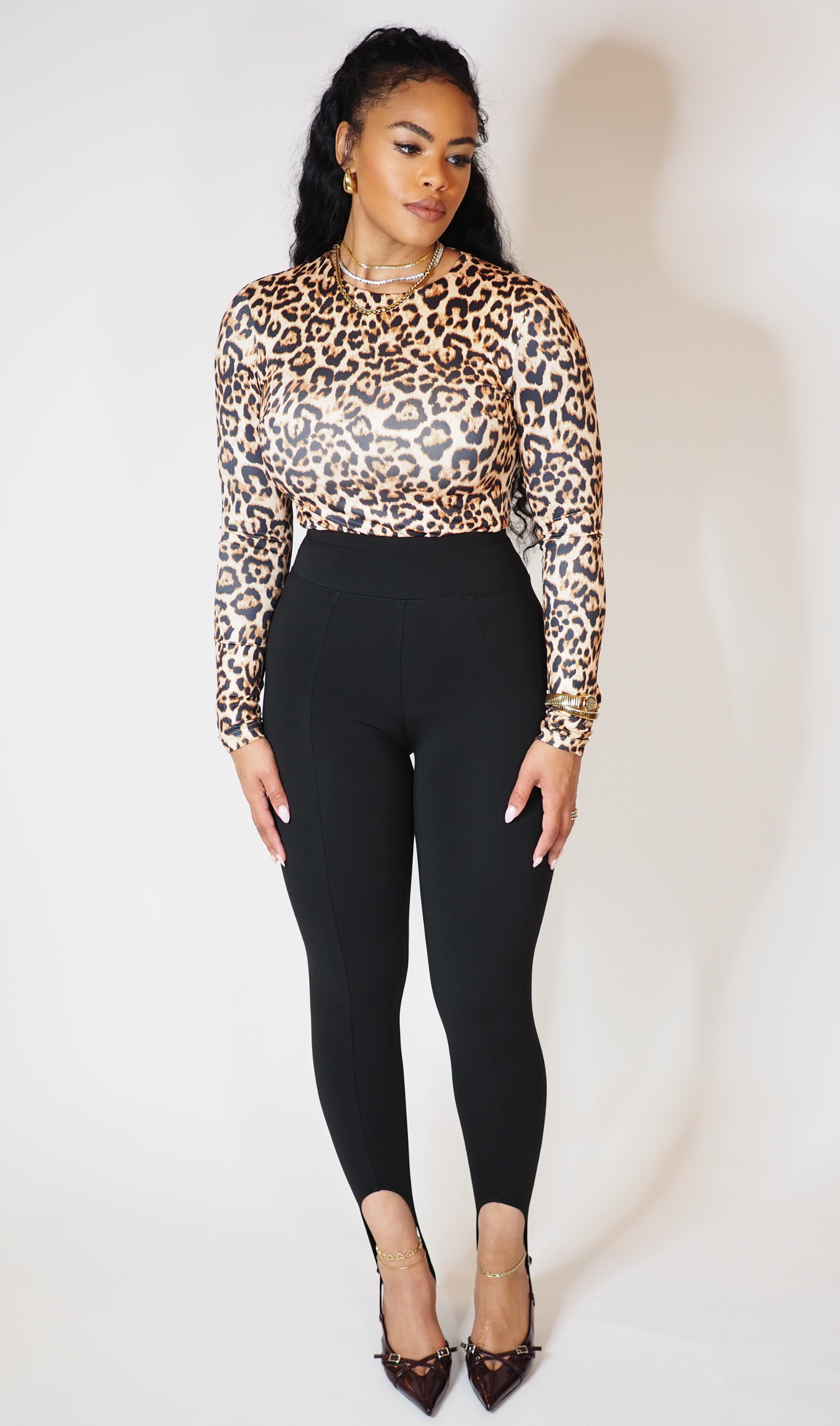 LEOPARD PRINT BODYSUIT FEATURING STRETCH FABRIC WITH A SMOOTH, BODY SLIMMING FIT. SNAP CLOSURE AT BOTTOM. LIGHTWEIGHT, BREATHABLE, EASY TO LAYER.